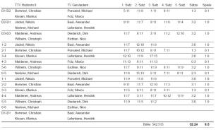 In den Einzeln zeigten dann insbesondere Nikola Jäckel und Christoph Wilhelm jeweils durch 2 gewonnene Spiele eine starke Leistung. Die restlichen Punkte konnten dann Christian Bommer, Markus Klesen und Andi Maldener beisteuern.
