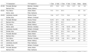 Vorne konnte dann Nikola mit einer gewohnt starken Vorstellung beide Einzel gegen Poncelet und Berhard jeweils mit 3:0 gewinnen. Florian zeigte ebenfalls eine sehr gute Leistung und verlor gegen den unangenehm spielenden Poncelet zunächst knapp mit 2:3, konnte dann im 2. Einzel dann aber gegen Berhard einen deutlichen 3:1 Sieg für uns einfahren.