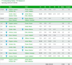 Dabei lagen wir nach den Anfangsdoppeln durch die Siege von Nikola/Katharina (3:2 gg. Schütz/Hemmer) und Markus/Christoph (3:0 gg. Scherer/Kreuz) zunächst mit 2:1 in Führung.