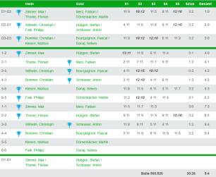 Die Punkte für uns erzielten die Doppel Max/Flo, Christoph/Philipp und Christian/Markus und in den Einzeln holten dann Max (2), Flo (1), Christian (1), Markus (1) und Philipp (1) die nötigen Zähler zu dieser tollen Mannschaftsleitung.