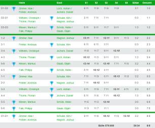 Besonders Max zeigte sich dabei in überragender Verfassung und konnte sowohl beide Doppel an der Seite von Andy, sowie auch beide Einzel gegen Joshua Wagner und Kim Schulze mit teilweise spektakulären Ballwechseln gewinnen und hatte so den Hauptanteil an diesem Erfolg.