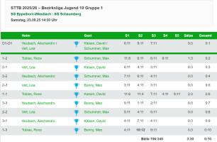 Einen prima Start in die neue Saison schaffte unsere U19 in der Aufstellung David Klesen, Max Schummer und Meo Bonny. Bei dem klaren 10:0 Erfolg musste unser Team dabei lediglich 3 Sätze ihren Gegnern überlassen. Weiter so!
