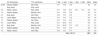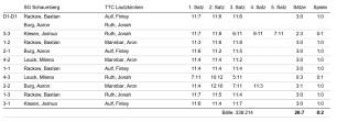 In der Aufstellung Bastian Rackow, Aaron Burg, Joshua Klesen und Milena Lauck konnten Bastian/Aaron mit ihrem Doppelsieg und in den Einzeln Bastian (3), Aaron (2), Joshua (1) und Milena (1) die Punkte für unsere Mannschaft beisteuern.