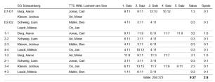 Im Spiel gegen Losheim mussten wir mit der Aufstellung Aaron Burg, Liam Schweig, Joshua Klesen und Milena Lauck erneut ohne unsere beiden Stammkräfte Bastian und Daniel antreten. Gegen die, gegenüber der Vorrunde deutlich verstärkten Gegner konnte so lediglich Aaron seine gute Form beweisen und seine beiden Einzel gewinnen und Joshua musste sich in einem Einzel nach guter Leistung nur ganz knapp geschlagen geben.