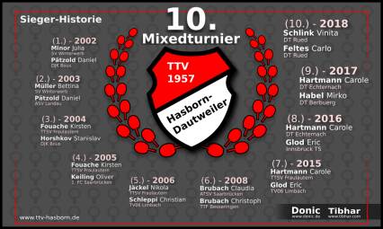 Beim 10. Hasborner Mixedturnier 2018 konnte sich das Ehepaar Vinita Schlink / Carlo Feltes vom DT Rued aus Luxemburg durchsetzen. Im Finale gewannen die beiden gegen Nikola Jäckel (Hasborn) / Kevin Mertes (DT Lintgen). Carlo setzte sich 3:0 im Einzel gg Kevin durch. Nikola gewann mit 3:1 gg Vinita und im entscheidenden Mixed setzte sich die Luxemburger Kombination mit 3:1 durch. Zuvor konnten Schlink/Feltes im Halbfinale ebenfalls mit 2:1 gg Angela Koch (Fraulautern) / Jan-Philipp Becker (Wehrden) gewinnen. Hier gewann Carlo nach einem tollen Spiel mit 3:2 gg Jan-Philipp, Angela Koch gewann mit 16:14 im 5. Satz gg Vinita und das Mixed ging mit 3:1 an Schlink/Feltes. Im zweiten Halbfinale gewannen Jäckel/Mertes mit 2:0 gg Gefele/Brendel. Hier setzte sich Nikola mit 3:0 gg Carina Gefele durch und auch Kevin gewann mit 3:0 gg Marco Brendel. Im Viertelfinale waren zuvor Jan Philipp Becker und Angela Koch mit jeweils 3:1 Siegen über Yvonne Thönes (Berus) / Marco Jäckel (Hasborn) siegreich. Schlink / Feltes setzten sich gg Benard / Otterbach (beide Nistertal) durch, indem Feltes mit 3:1 gg Otterbach und Schlink mit 3:2 gg Benard gewannen. Mertes / Jäckel waren mit 2:0 gg Monika Kiefer / Lukas Killian (beide Pirmasens) mit je 3:0 Einzelerfolgen siegreich und Carina Gefele (Niederlinxweiler) / Marco Brendel (Wustweiler) gewannen gg Anna Crummenauer (Niederlinxweiler) / Andi Maldener (Hasborn) durch jeweils 3:1 Einzelsiege.Die Trostrunde gewannen Minh Nguyen / Rouven Christmann durch den 2:1 Finalsieg gg Sorgatz / Scheer. Hier gewann zunächst Sorgatz mit 3:0 gg Nguyen, Christmann konnte gg Scheer durch ein 3:0 ausgleichen und das abschließende Mixed entschieden Nguyen/Christmann mit 3:1 für sich.